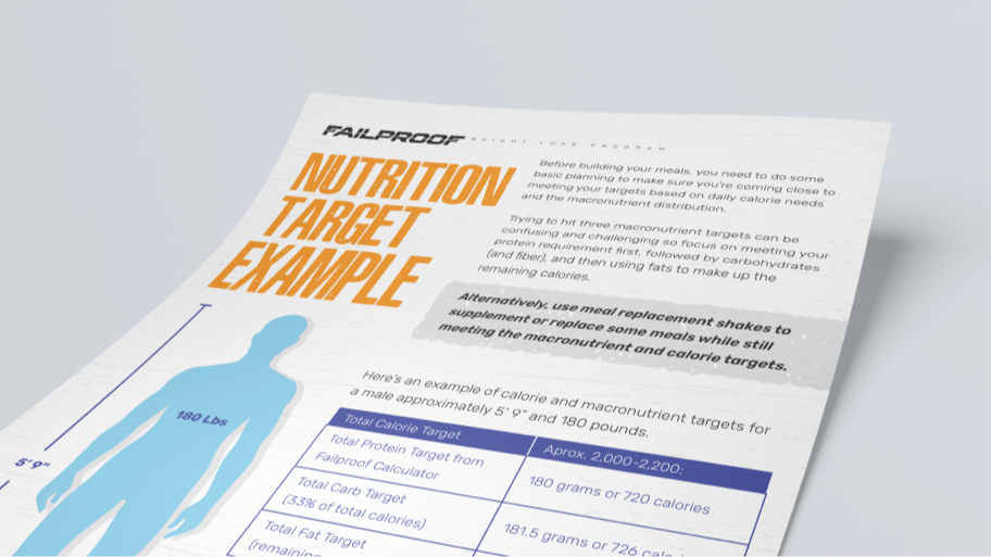 An example of daily calorie and macronutrient targets for a male, along with meal plan examples and nutrition facts.